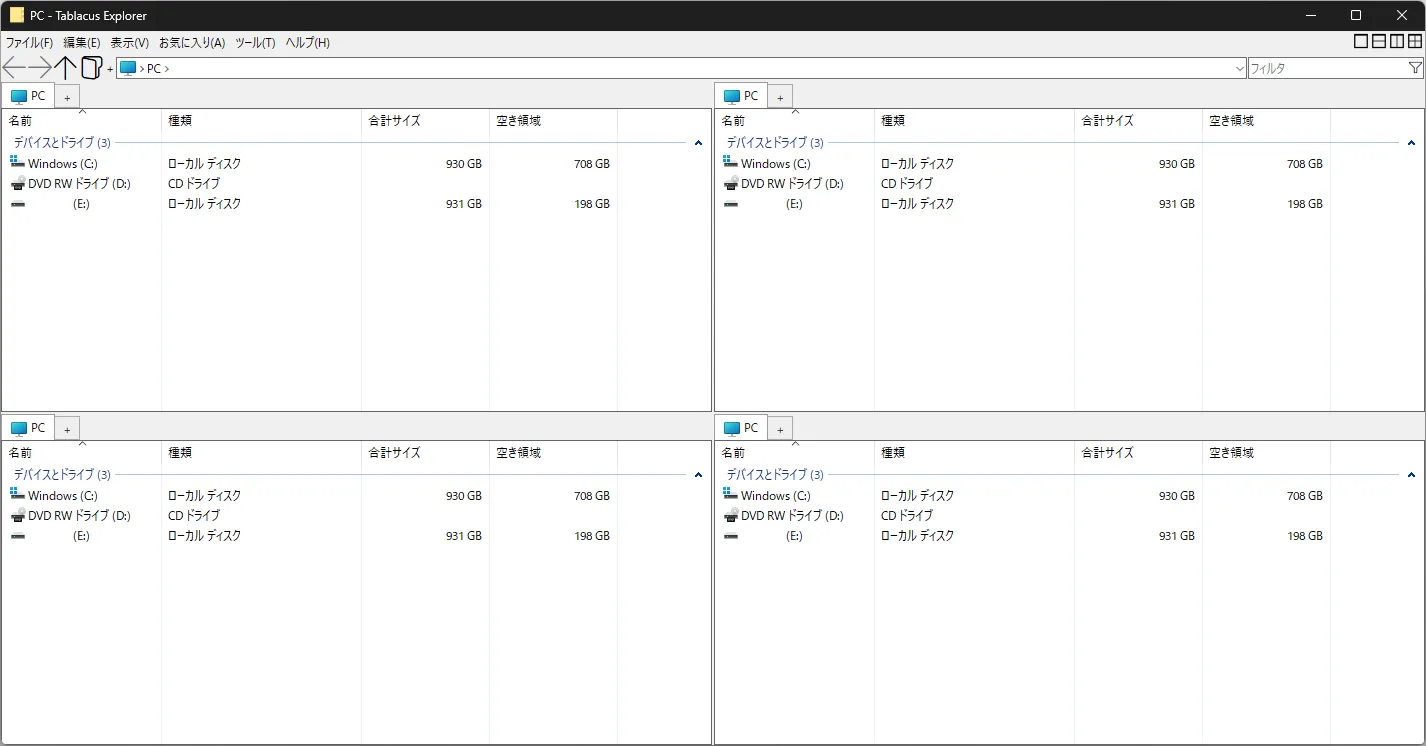 Tablacus Explorerはその名の通り「タブ型のファイルエクスプローラー」です。普段皆さんが使っているウェブブラウザー(Google ChromeやSafariなど)と同じように、複数のタブ(ページ)を活用してファイル管理を効率的に行なうことが出来ます。